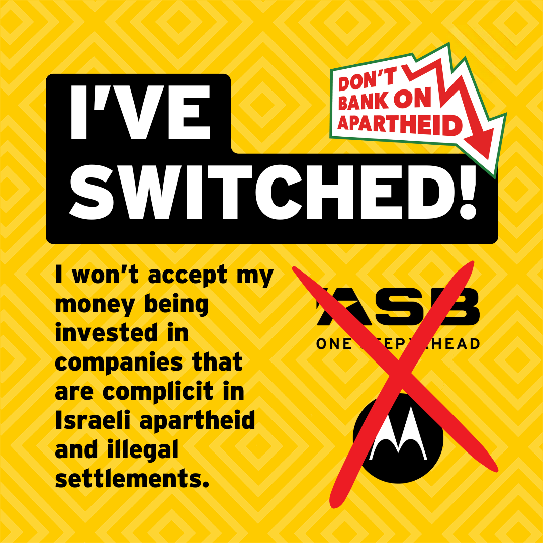 ASB Bank has $14 million of OUR money invested in Motorola. We are calling on ASB to stop knowingly making its customers complicit in apartheid - or risk losing thousands of us to more ethical providers.